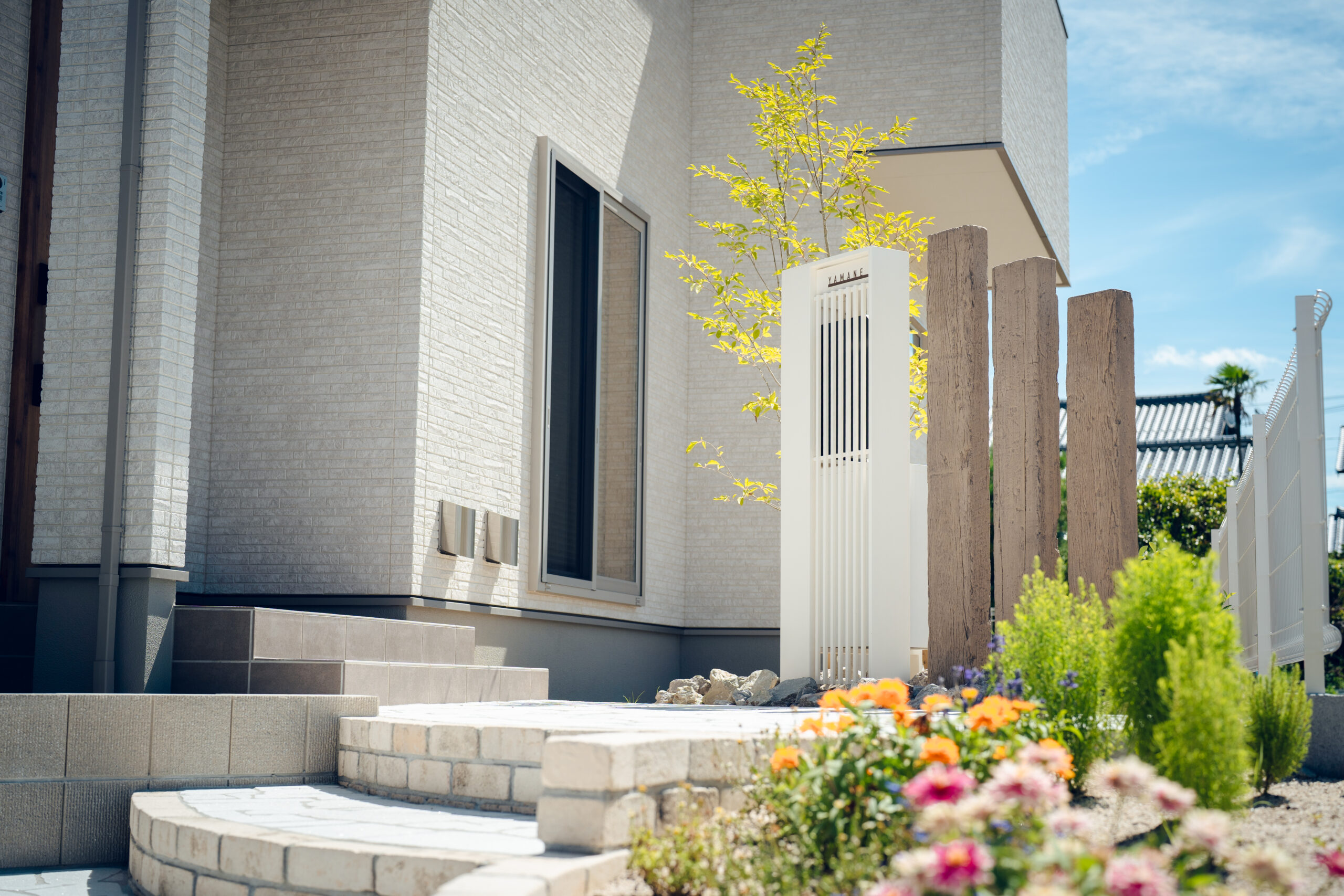 アンティークな雰囲気なナチュラル外構 2024 10/17 WORKS ALL / NEW CONSTRUCTION / アプローチ カーポート 植栽 機能門柱 花壇 門柱 駐車場 アンティークを感じさせるレンガの素材感が おしゃれさを際立たせる外構 洗練された雰囲気の中に アンティークを感じさせるレンガの素材感が おしゃれさを際立たせる外構に。 全体的なホワイトカラーに 馴染みながらも印象付けるナチュラルカラー。 機能性門柱の横には植栽と、 本物の質感と見た目を叶えつつ 耐久性に優れるコンクリート枕木で深い味わいを演出。 階段や駐車場のアーチ状の目地には レンガ風のデザインを施し、 全体の統一感が生まれおしゃれさがグッと増します。 一覧へ戻る その他の施工事例 タイル貼り門柱でおしゃれでスタイリッシュなデザイン シックで落ち着いた色を使った外構 ガビオンを使った新感覚なおしゃれ外構 憧れの人工芝を存分に楽しめる庭 手入れしやすい外構 手入れ少なく緑と暮らす庭 一覧へ戻る WORKS ALL / NEW CONSTRUCTION / アプローチ カーポート 植栽 機能門柱 花壇 門柱 駐車場